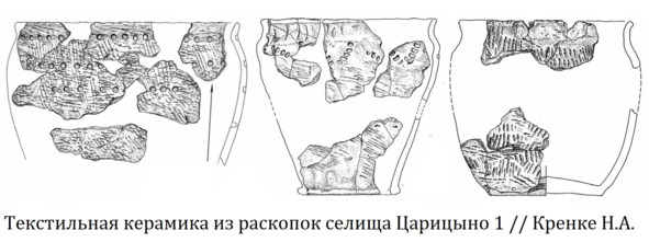 Комплекс керамики с текстильными отпечатками был обнаружен на уже упомянутом поселении Царицино 1 «Церера», выявленный на этом месте ров, датирующийся временем не позднее VIII – VI вв. до н.э., является одним из древнейших оборонительных укреплений в москворецком регионе. Такая же керамика найдена на Дьяковом городище и селище Чертов городок в Коломенском, а также на Боровицком холме на территории московского Кремля, всего зафиксировано около двух десятков поселений, погребений не известно, подобные памятники являются предшественниками городищ дьякова типа, а носители этой культуры предками дьяковских племён.