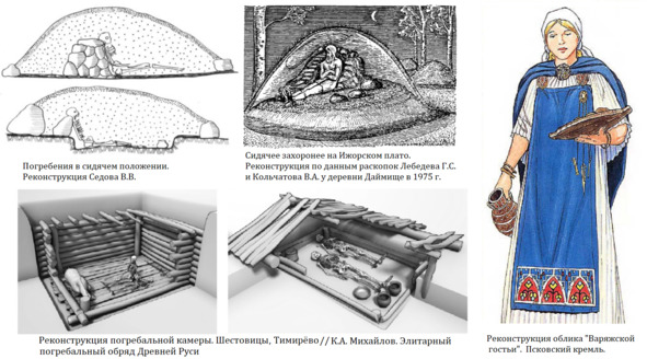 Так, по мнению археолога Лесмана М. Ю., между длинными курганами и сопками, с одной стороны, и древнерусскими курганами и жальниками, с другой, лежит хронологическая лакуна – первая половина XI века, которую заполнил совершенно особый тип памятников – поверхностные могильники с кремациями и ингумациями, такие памятники известны на Ижорском плато, в Ладоге, Пскове, Большом Тимерёво, Шестовицах и Гнездово. Погребения в них помещались в специально сооружённые просторные помещения – камеры. Самым известным является захоронение «Варяжской гостьи», открытое недалеко от центра Пскова, представляющее собой деревянный сруб, разделённый на две части (комнаты) – северную (жилую, где находились останки женщины в богатом убранстве), и южную (хозяйственную, с предметами утвари). Захоронения, произведенные по этому обряду широко известны в Скандинавии, где они были распространены с конца IX по конец X вв. Интересной особенностью погребального обряда некоторых древнерусских камерных погребений является захоронение в них лошади, причем вместе с упряжью и обязательно целиком, что влияло на саму конструкцию камерного сооружения.