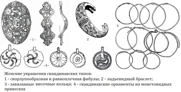 На Северо-Западе Руси находки женских украшений, относящихся к характерным для Скандинавии типам, достаточно многочисленны и разнообразны, это скорлупообразные и равноплечные фибулы, ладьевидные браслеты, завязанноконечные височные кольца и различные скандинавские орнаменты на подвесках и других украшениях.