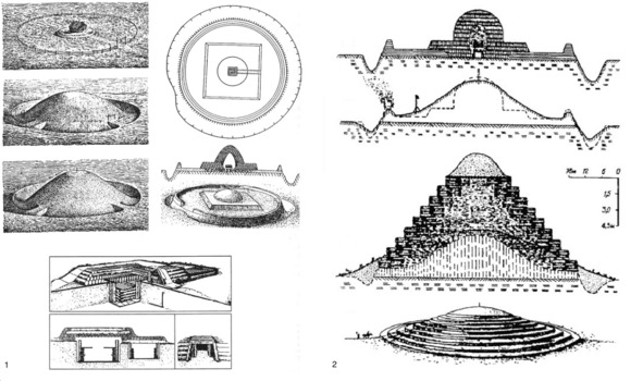1. Погребальная камера, сложенная из сырца, деревянные конструкции и вход. Реконструкция В. Ф. Генинга. 2. Реконструкция храма высотой 9—11 м., стоящего наверху. // Зданович Г. Б., Малютина Т. С. Большой синташтинский курган – древнейшее храмово – погребальное сооружение степной Евразии.