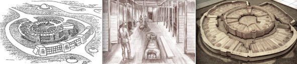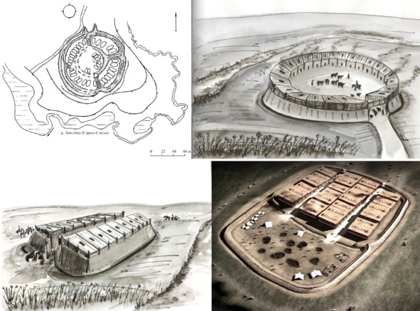 Аркаим: 1—2. Графическое изображение общего вида и внутреннего интерьера жилищ. 3. Макет. Реконструкция Г. Б. Здановича