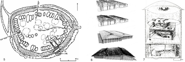 1—2. Сарым-Саклы. 3. Устье. 4. Ольгино. 5. Аландское. 6 – 7. Реконструкция жилищ и пгребений синташтинского типа // Государственный историко-культурный заповедник «Аркаим»