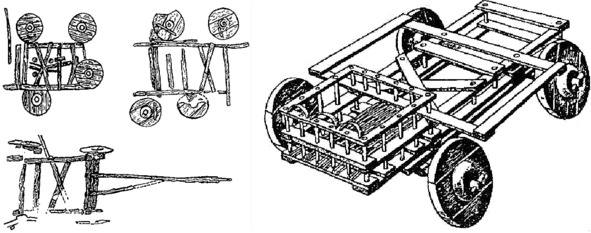 1. Деревянные повозки ямного периода. 2. Ходовая часть повозки ямной культуры. Реконструкция по А. М. Гею