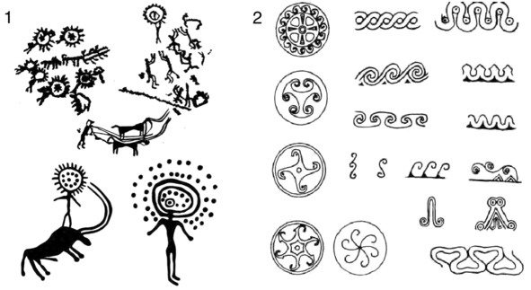 1. Петроглифы с солнцеликим персонажем и сценой охоты. 2. Микенские орнаменты (по Г. Каро и А. Фурумарку), представленные на псалиях, бляхах и керамике комплексов эпохи ранней бронзы в евразийских степях // Кузьмина Е. Е. Откуда пришли индоарии, 1994 г.