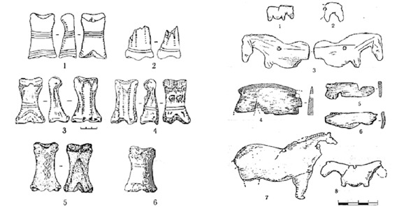 I. Украшенные путовые кости коня со стоянок Самарской культуры (1—4 – Варфоломеевская, 5 – Виловатовская, 6 – Ракушечный Яр). II. Костяные подвески в виде коня (1—3 – Варфоломеевская, 2 – Липовый Овраг, 5—6 – Виловатская, 7—8 – Съезжее)