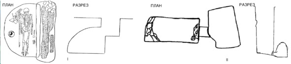 • Погребальные ямы прямоугольной формы с отвесными стенками или с уступами.