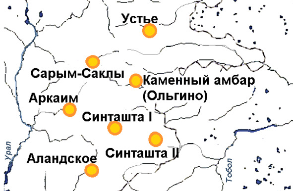 В настоящее время в Челябинской и Оренбургской областях найдено более 20 укреплённых центров, святилищ и селищ. Самые известные из них – Синташта, Аркаим, Устье, Каменный Амбар, Сарым-Саклы в Челябинской области и Аландское в Оренбургской. Это так называемый Волго-уральский очаг культурогенеза или «Страна городов».