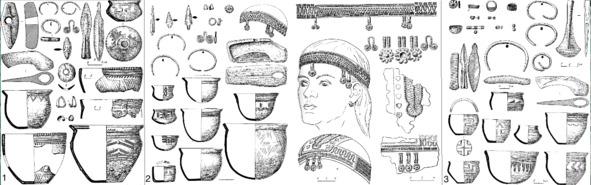 1.Доно-волжская абашевская культура. 2.Средневолжская абашевская культура, реконструкция женского головного убора. 3.Уральская абашевская культура // Эпоха бронзы лесной полосы СССР. Археология СССР. 1987 г.