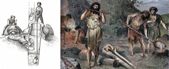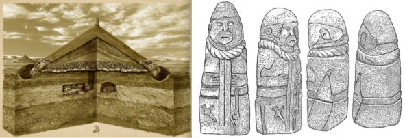 1. Скифский курган в разрезе. Художник-иллюстратор Евгений Край. 2. Стела скифа-воина, найденная в селе Ольховчик Амвросиевского района Донецкой области // Собрание Донецкого областного краеведческого музея.