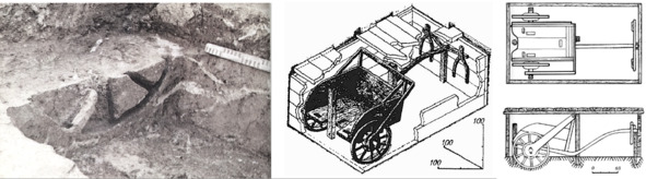1. Следы колесницы; фото Н. Б. Виноградова. 2-3. Реконструкция колесницы из погребений 28 и 12 большого грунтового могильника. Синташта.