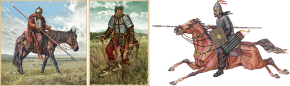 1. Сарматский воин. Степи Северного причерноморья. II—I вв. до н э; 2. Ранне-сарматский рыцарь. Художник-иллюстратор Евгений Край. 3. Сарматский легковооруженный воин. II в. до н э – II в. н э. Иллюстрация для «Большого Атласа Казахстана».