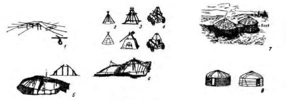 Типы лёгких жилищ кочевников. 1 – шатёр; 2 – чум; 3 – конструкция скифского лёгкого жилища; 4 – реконструкция скифской повозки; 5, 6, 7 – наземные жилища; 8 – современная юрта. // Кузьмина Е. Е. Откуда пришли индоарии, 1994 г.