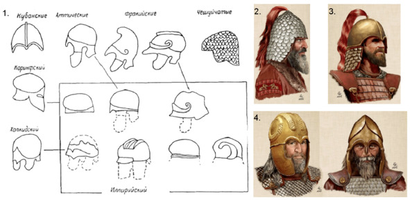1. Типы шлемов // Черненко Е. В. Скифский доспех. 1968 г. 2. Шлемы «чешуйчатых типов» 3. Шлемы «кубанского типа» 4. Шлемы античных типов. Художник-иллюстратор Евгений Край.
