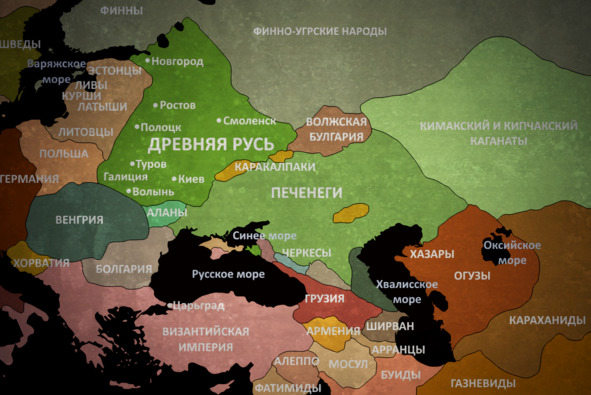 Кристаллизуются три центра силы – Киев, Владимир и Великий Новгород. Сюда можно добавить Полоцк, столицу будущей Беларуси. Киев является форпостом русской цивилизации. Южнее, за системой неизвестно кем возведенных Змиевых валов, находятся владения половцев и монголов, с островком русских владений, Тмутараканью.