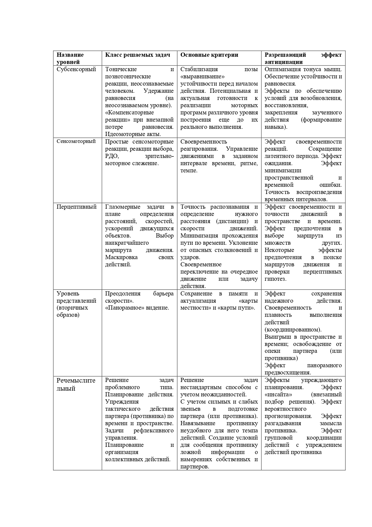 Далее следует рассмотреть гипотезу Б.Ф. Ломова и Е.Н. Суркова, в ней антиципация рассматривается как многоуровневая система, авторы подчеркивают, что эти уровни взаимосвязаны и их ни коем образом нельзя изолировать друг от друга. Исходя из их теории можно выделить когнитивную, регулятивную и коммуникативную функции антиципации. Когнитивная антиципация представляет собой предвосхищение каких-либо событий, самый простой пример: когда мы спотыкаемся, то можем мгновенно предположить, что упадем. Регулятивная функция проявляется, когда мы готовимся к событиям и планируем действия, то есть возвращаясь к предыдущему примеру, когда мы предположили, что упадем, то можем сгруппироваться и падение будет не таким болезненным. И последняя функция коммуникативная подразумевает любое общение между людьми, их взаимодействие, готовность подчиниться социальным и культурным нормам, способность мгновенно узнавать эмоциональные состояния других, оценивать социальный контекст. Именно последняя коммуникативная функция интересует нас в рамках нашего исследования. Также Б.Ф. Ломов и Е.Н. Сурков в своих работах выделили уровни антиципации, их описание можно кратко представить таблицей 1.1.