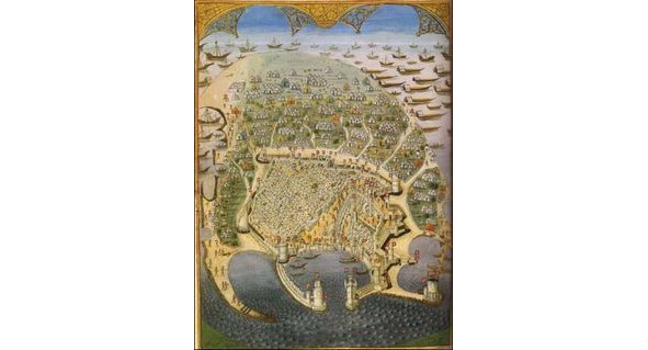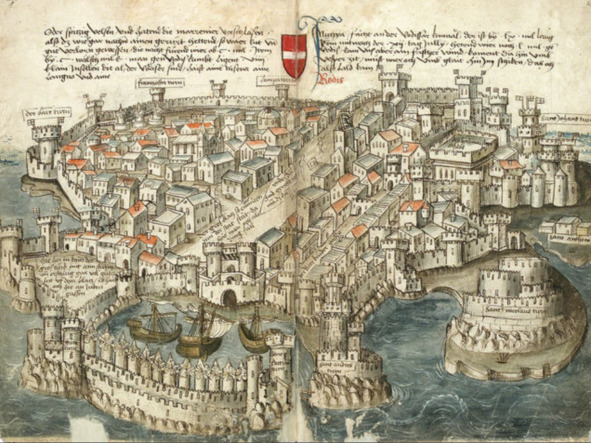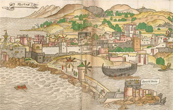 Остров Родос и его порт в 1486 году. Фрагмент гравюры на меди.