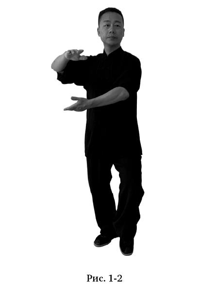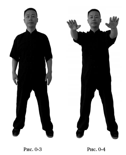 Руки опустить. Перенести вес на правую ногу, левую отставить в сторону на ширину плеч, корпус прямой (рис. 0–3). Руки поднять перед собой горизонтально до уровня плеч ладонями вниз, взгляд направлен вперёд, корпус ровный (рис. 0–4).
