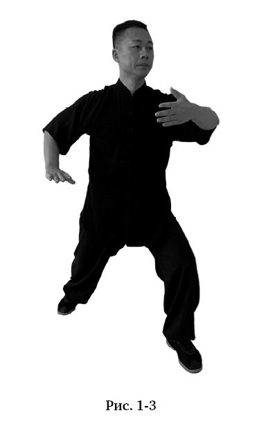 Левой ногой сделать шаг вперёд-влево по диагонали в 45°, перенести на неё вес, перейдя в стойку лучника гунбу. Левую руку поднять по дуге вверх до уровня груди, ладонь повёрнута к себе; правой рукой сделать нажимающее движение вниз до уровня пояса справа (рис. 1–3).