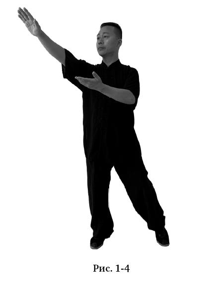 Центр тяжести перенести назад, приставить левую ногу на ширину плеч, носок касается земли. Корпус немного развернуть направо. Одновременно руки провести вправо круговым движением по часовой стрелке: правая движется по большому кругу до диагонали вправо-вверх, ладонь направлена вниз, левая – по малому кругу ладонью вверх, ладонь левой доходит до локтя правой. Взгляд в сторону ладони правой руки (рис. 1–4).