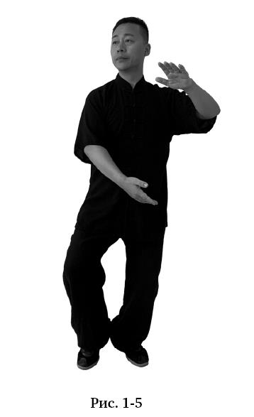Корпус повернуть слегка влево, центр тяжести сместить на левую ногу. Правую ногу приставить на носок на уровне середины левой стопы, обе ноги слегка согнуты. Правую руку развернуть ладонью вверх и по дуге подвести вниз к левой стороне живота. Левую руку одновременно развернуть ладонью вниз на уровне груди. Руки как будто обхватывают шар слева, но левая ладонь немного впереди правой. Взгляд направлен вправо (рис. 1–5).