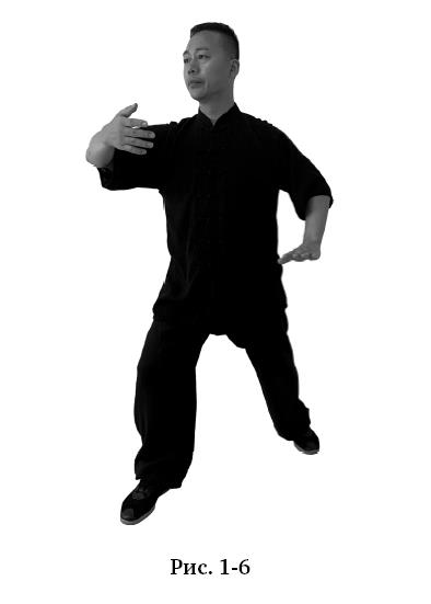 Правой ногой сделать шаг вперёд-влево по диагонали в 45°, перенести на неё вес, перейдя в стойку лучника – гунбу. Правую руку поднять по дуге вверх до уровня груди, ладонь повёрнута к себе, левой рукой сделать нажимающее движение вниз до уровня пояса слева (рис. 1–6).