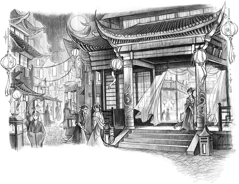 За воротами оказался совершенно другой мир, значительно отличающийся от безжизненной пустоши. Никогда еще я не видел настолько поразительного ночного города, освещаемого бесконечными фонарями. Все до единого они были красными и имели форму приплюснутого шара с кисточкой на конце. На вид фонари казались сделанными из бумаги или расшитого узорами тончайшего шелка, натянутого на деревянный каркас. Огонь в них бился опасными всполохами, вырываясь наружу танцующими язычками. Еще одно мгновение – и пламя поглотит непрочный материал, превратив его в горсть пепла. Но, на удивление, фонари оставались целыми и продолжали светить, рассеивая мглу.