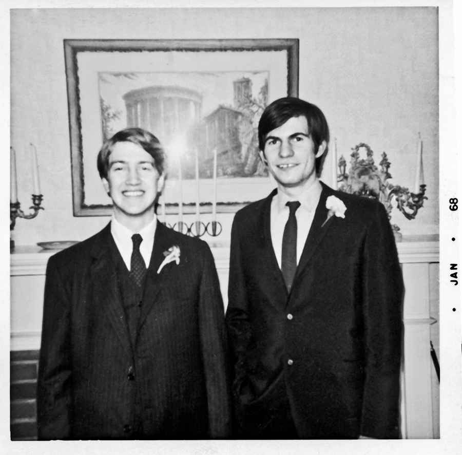 Линч и его шафер, Джек Фиск, на вечеринке 1968 года по случаю свадьбы Линча и Риви; прием проходил в доме родителей Риви. Фотограф: Пегги Риви.