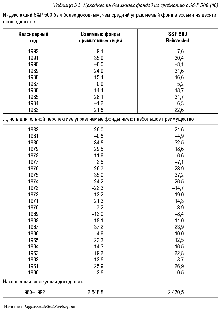 Итак, следует ли вам перестать искать управляемый фонд среди сотен, представленных на рынке, инвестировать в индексный фонд или в несколько индексных фондов – и успокоиться? Я обсуждал эту возможность с Майклом Липпером, признанным специалистом в области взаимных фондов. Его данные приведены в табл. 3.3. Здесь сравниваются показатели большой группы управляемых фондов, называемых General Equity Funds, с индексом S&P 500 Reinvested, который по определению аналогичен индексному фонду, отличающемуся только небольшой комиссией.