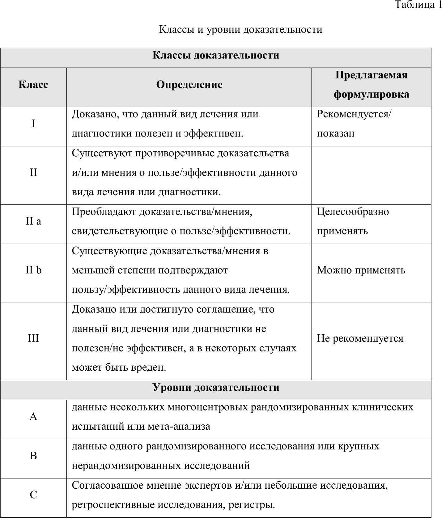 В таблице 1 представлена классификация рекомендаций, включающая классы и уровни доказательности, их определение и интерпретация.