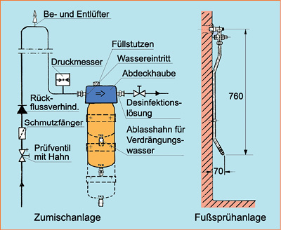 Desinfektions - Zumischgerät mit Versor-gung einer Fußsprühstelle. Dieses festinstallierte Zu-mischgerät arbeitet nach dem Venturi-Wirkdruckprin-zip. Hierbei saugt der Injektor eine einstellbare Menge Desinfektionsmittel proportional zum Wasserstrom an.