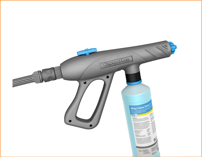 Flächendesinfektion mit Sprühpistole: Den Deckel von der Produkt-Flasche abschrauben, den Saugschlauch einführen und gut handfest verschrau-ben. Wasserhahn aufdrehen, dann Kugelhahn öffnen und mit dem Aufbringen der Gebrauchslösung starten. Ist die Fläche benetzt, Kugelhahn wieder schließen und Gebrauchslösung einwirken lassen. Zum Abspü-len Wasserschlauch von der Sprühpistole abkoppeln und mit vollem Wasserdruck spülen. (Sprühpistole für gleichmäßige Benetzung bei geringer Nässe und ohne Aerosolbildung Typ „Witty-Speed Maxx Blue“, Witty, Dinkelscherben)