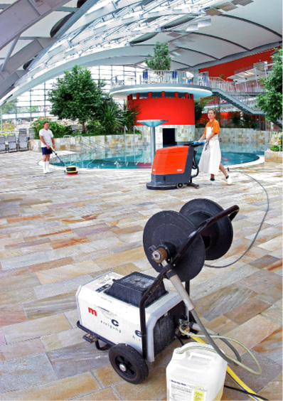 Auf die Flächendesinfektion wurde bereits beim Abschnitt Schwimmbadreinigung hingewiesen. Alle Barfuß- und Nassbereiche sind täglich ei-ner Desinfektion zu unterziehen. Geeignet sind geprüfte Desinfektionsreiniger, die nachweis-lich gegen Bakterien, Hautpilze und behüllte Vi-ren wirken. Zur Reduzierung der Erregerlast ist zusätzlich eine Wirksamkeit gegen Warzenviren empfehlenswert.