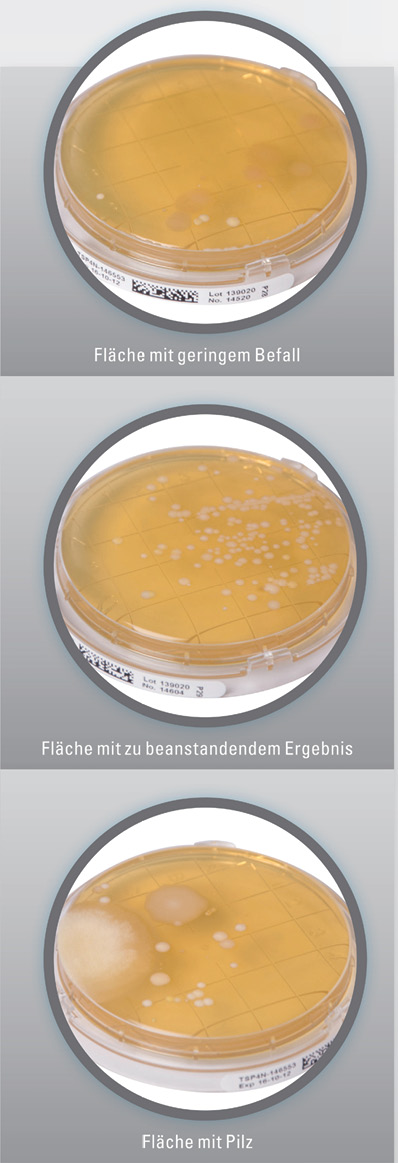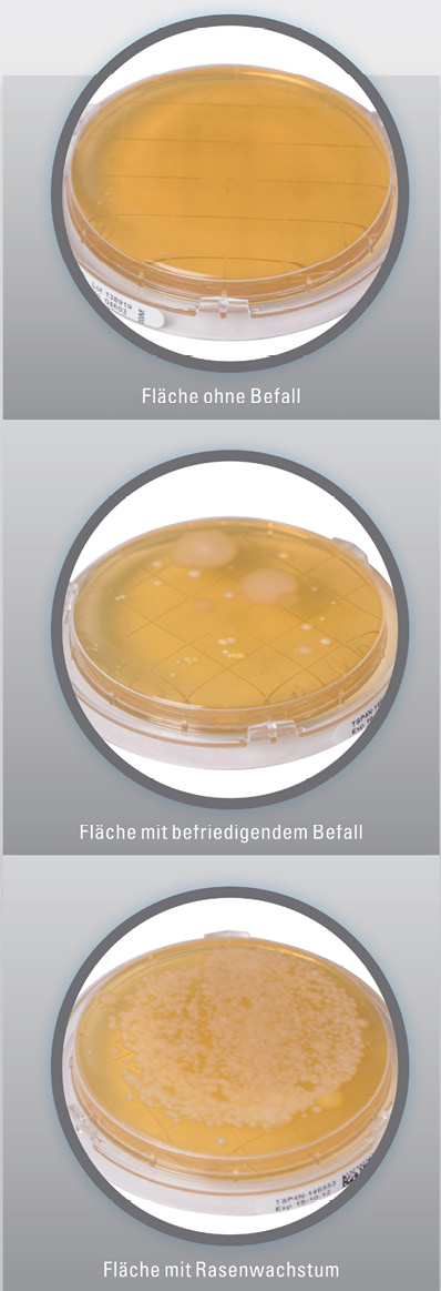 Durch einen Abklatschtest (Keimtest) erfolgt der Nachweis der koloniebildenden Einheiten (KBE) auf Oberflächen. Die sogenannte Gesamtkeim-zahl bezeichnet alle lebenden Mikroorganis-men auf einer Fläche oder in einer Flüssigkeit. Auch wenn die Virenlast nicht festgestellt wer-den kann, dient der Wert der KBE als Indikator für die Qualität der Hygiene.