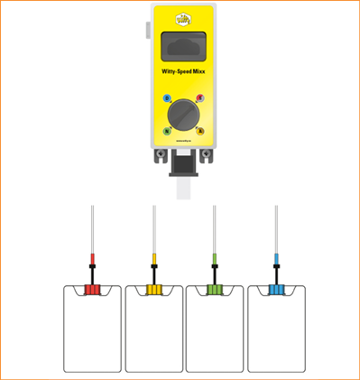 Durch Betätigen eines Dosierhebels oder einer Taste wird der ausgewählte Reiniger in ge-wünschter Konzentration mit Netzwasser vermischt. Für die manuelle Reinigung und Desinfektion sowie für das Befüllen von Fahrautomaten. Farbkonzepte ver-hindern Verwechslungen. (Dosiermischer Typ „Witty-Speed Mixx“, Witty, Dinkelscherben)