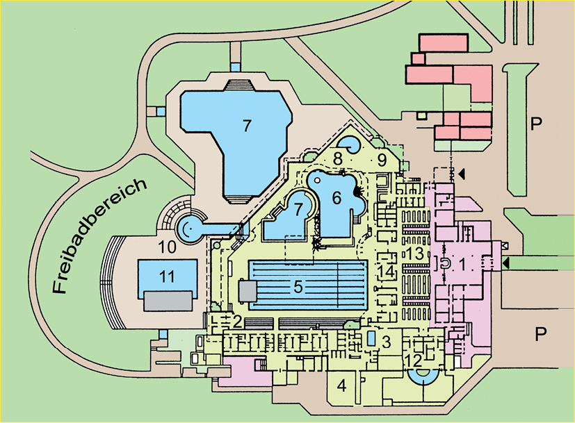 Anlagen für den Wettkampfsport, Zuschauer-anlagen, Anlagen zur Bewirtung (Café, Restau-rant), Liegeflächen, Spiel- und Freizeiteinrich-tungen des Nass- und Trockenbereichs.