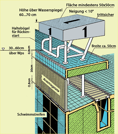 Nichtschwimmerbecken: max. 1,35m tief. Sprin-gerbereiche müssen zum Zeitpunkt ihrer Errich-tung mindestens den Angaben der „Richtlinien für den Bäderbau“ entsprechen. Unter Startso-ckeln: mindestens 1,80m Tiefe über 5m Länge. Wassertiefen müssen unmittelbar am Rand jeden Bereiches deutlich erkennbar und dau-erhaft angegeben sein. Die Kennzeichnungen müssen vom Beckenrand aus erkennbar sein.