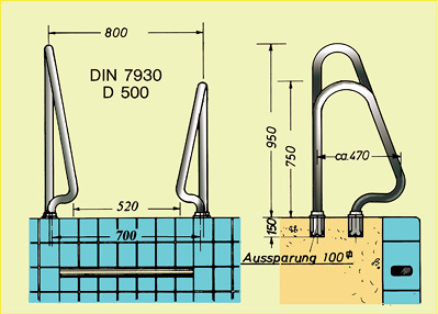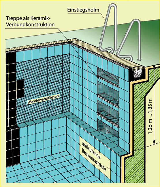 Beckensteigleitern sind wandbündig in Nischen bis zur Raststufe auszuführen. Jedoch mindestens eine Leiter sollte bis zum Beckenboden rei-chen. Leiternholme dürfen nicht ins Becken ragen und nicht mehr als 15cm vom Beckenrand zurückstehen.