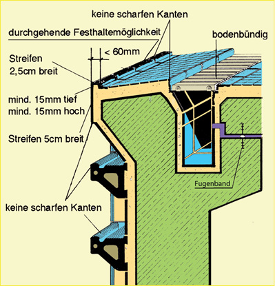 3. Bei einer „Finnischen Rinne“ ist die senkrechte Wand mindestens 5cm und die waagerechte Fläche 2,5cm deutlich farblich abgesetzt.