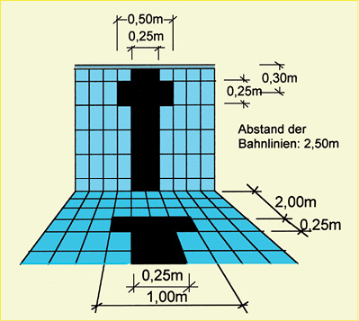 Schwimmstreifen (Bahnlinien) nach FINA, Maße gelten für Anstrich, bei Fliesen werden sie durch die Platten 11,5/24 oder 15/15cm bestimmt.