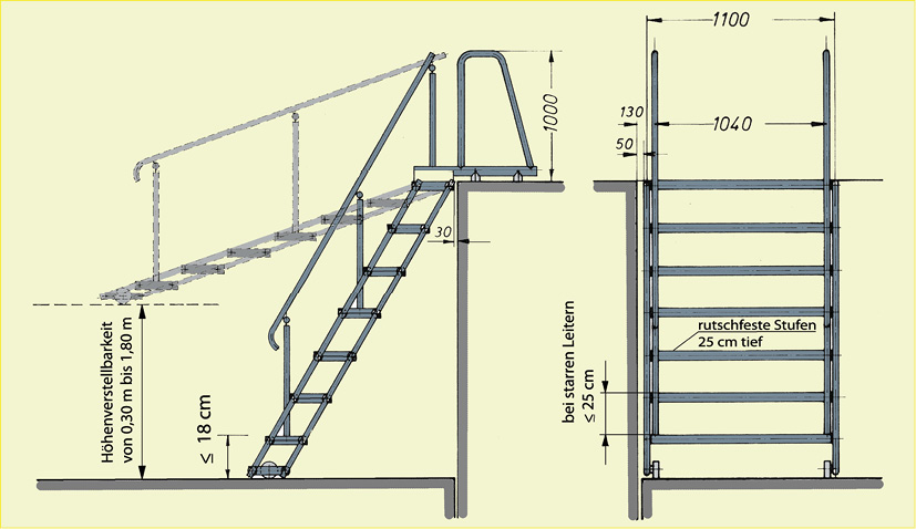 Einsteigtreppen in Schwimmbädern sind par-allel an der Längsseite mindestens 1m breit einzubauen. Sie enden auf einem Podest in Raststufenhöhe und sind mit einem Handlauf zu versehen. Podeste und Trittstufen sind rutsch-hemmend auszubilden. Man unterscheidet star-re Einstiege und verstellbare Treppen. Bei letz-teren dürfen die Stufen höchstens 18 cm hoch sein, und der Zwischenraum zum Beckenboden mind. 100mm betragen. Die Höhenverstellbar-keit beschränkt sich auf 1,50 m.