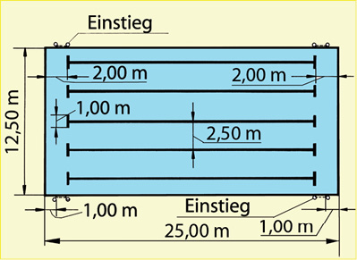Schwimmerbecken/Sportbecken mit norm-gerechten Schwimmstreifen und Anordnung der Ein-stiege