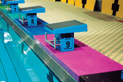 tionalen Schwimmverbandes (FINA) auszubilden (Maßgenauigkeit: +0,03 m bei 50 m- und +0,02 m bei 25 m-Becken, niemals kürzer). Rutschfestig-keit, farbige Gestaltungsmöglichkeit, Resistenz gegen Wasser, Chemikalien und mechanische Beanspruchungen sind die Hauptanforderungen an eine geeignete Beckenauskleidung.