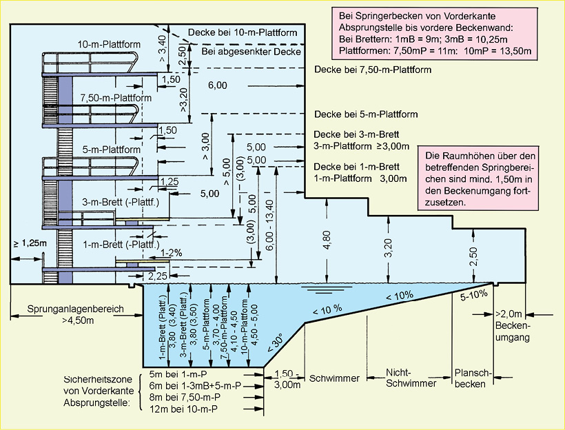 Sicherheitsabstände und Wassertiefen bei Sprunganlagen und Standardbecken
