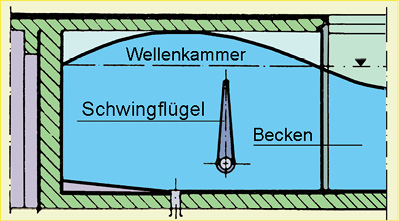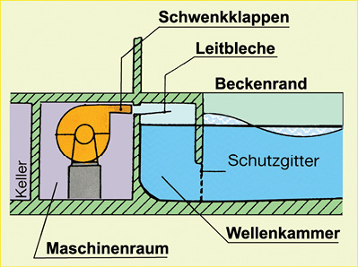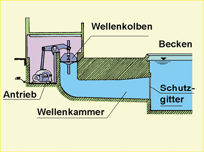 Bei allen Maschinen wird ein Druck auf die Wasser-fläche ausgeübt, der peri-odisch fortgeführt einen durchgehenden Wellenzug über das gesamte Becken bewirkt. Die Wirkungswei-se der Wellenmaschine muss so eingestellt sein, dass die Welle die ganze Breite des Beckens durch-läuft und in Beckenmitte am höchsten ist. Höhen: 0,60...1,00m. Wellenhöhen von 0,90m haben sich als optimal bewährt. Längen: 10,0 - 17,0m. Wellenfolge: 2,5...3,5 Sekunden. Während des öffentlichen Badebetriebs werden pro Stun-de etwa zwei- oder dreimal, jeweils 10...15 min Wellen erzeugt. Ein Maschinenraum; ein-schließlich einem erweiterten Beckenbereich zur Erzeugung der Wellen; muss an der Stirnseite des Beckens eingeplant werden. Bei Beckenlän-gen unter 50m ist der Einbau einer Hub- oder Klappwand zu empfehlen. In 50m-Becken kann ein Hubboden am flacheren Ende vorgesehen werden.