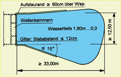 Am gegenüberliegenden Ende läuft die Wasser-tiefe zu Null aus. Eine Trittstufe von 15 cm...30 cm am Ende ist gleichfalls zulässig.
