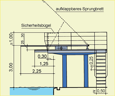 Ab Höhen von 1,0 m über dem Beckenum-gang sind Geländer vorzusehen, die die Plattform oder das Sprungbrett mindestens 1 m überragen. Der Zugang zu den 3-m- bis 10-m-Sprunganlagen ist nur seitlich ange-ordnet. Über 3 m Höhe ist ein Zwischenpo-dest erforderlich. Die Leiterbreite beträgt mindestens 50 cm, die Neigung ≤ 75°.