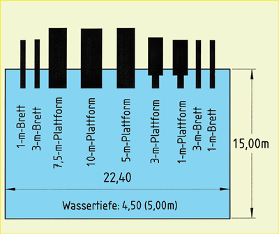 Kombinierte Sprunganlage nach den Richtli-nien für den Bäderbau.