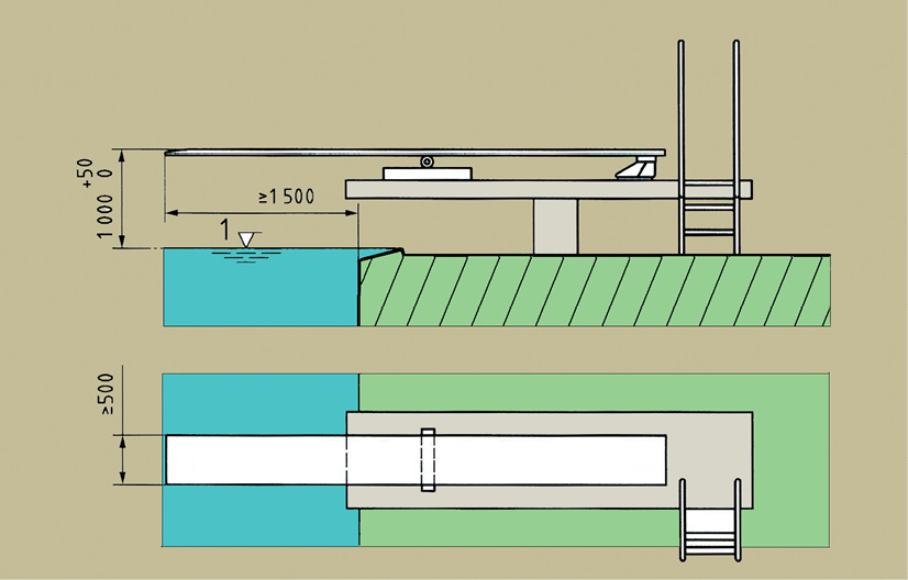 1-m-Sprungbrett-Anlage Typ1 (1 m hoch) mit Dur-Aluminium oder Glasfiber-Sprungbrett: Länge 4,80 m, Gefälle ohne Belastung nach hinten 1 ... 2% nach E DIN EN 13451