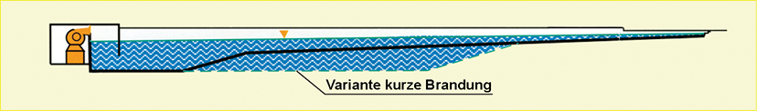 Rauhe Böden (Teppiche, strukturierte Fliesen) bremsen die Wellengeschwindigkeit am Welle-nende. Teppichbeläge im ganzen Becken haben sich in der Praxis nicht bewährt, da sie sich lösen und eine Brutstätte für Keime darstellen. Bodenneigung 10%, besser 6...8 %. Die Ein-richtung von Wasserattraktion sind im flacheren Beckenbereich möglich.
