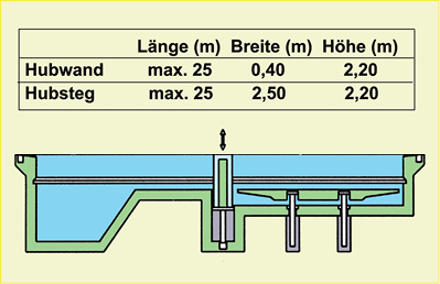 Zur Kontrolle des Beckenraumes unter dem Hubboden sollten in der Beckenwandung Beobachtungs-fenster und Beleuchtungseinrich-tungen eingebaut sein (Empfeh-lung).